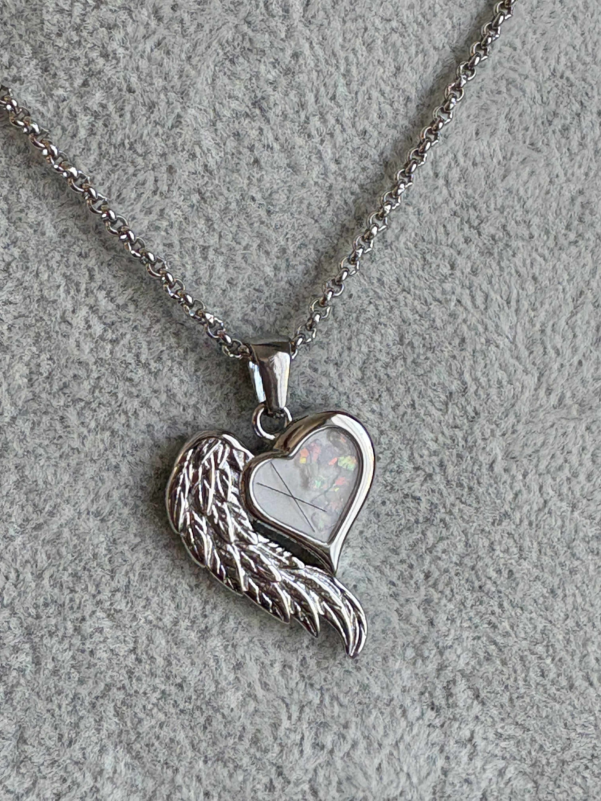 This stunning heart-shaped pendant features a delicate angel wing gently wrapped around one side β a beautiful reminder that your loved one is always watching over you.