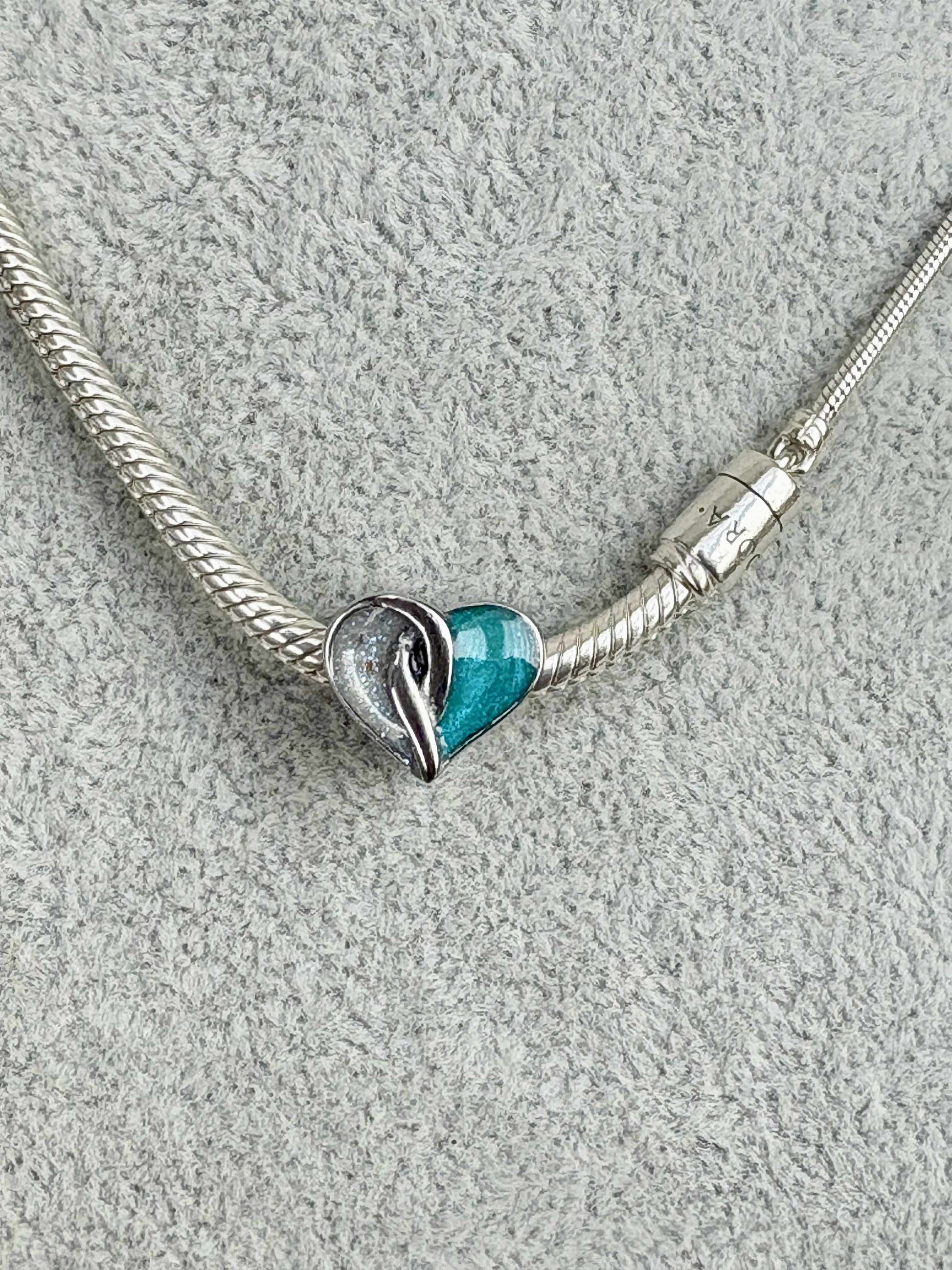 A symbol of everlasting connection, this heart-shaped charm features a striking crossover design where two distinct sections meet in perfect harmony. One or both halves can be filled with your chosen colour and keepsake inclusion.