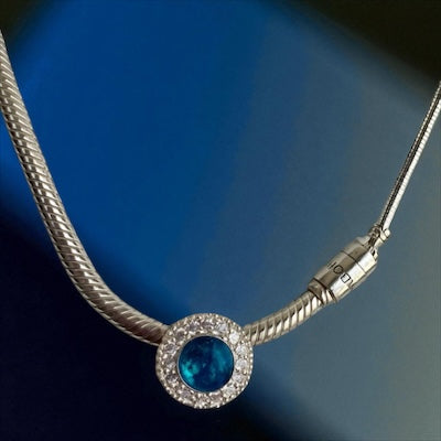 Encircled by a sparkling halo of cubic zirconia, the centre holds space for personal meaning — a subtle yet powerful reminder of love, memory, and presence. Designed to fit Pandora-style bracelets, it brings quiet elegance and heartfelt sentiment to every moment. Suitable for occasional wear.