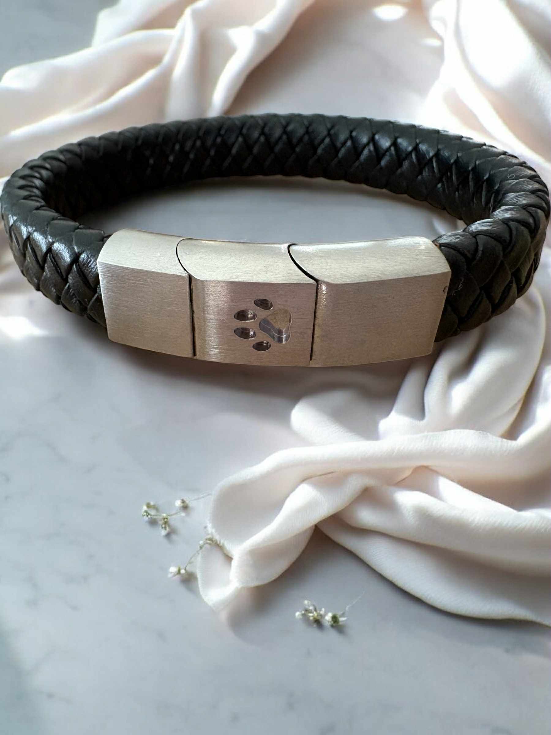 This bold and timeless memorial bracelet is crafted from woven black leather and finished with a sleek stainless steel clasp, making it a perfect keepsake for everyday wear. The discreet centre setting is designed to hold a small inclusion — such as ashes or fur, safely sealed to give a subtle and meaningful tribute. Strong, understated, and full of sentiment, this bracelet is a beautiful way to carry their memory with you, wherever life takes you.