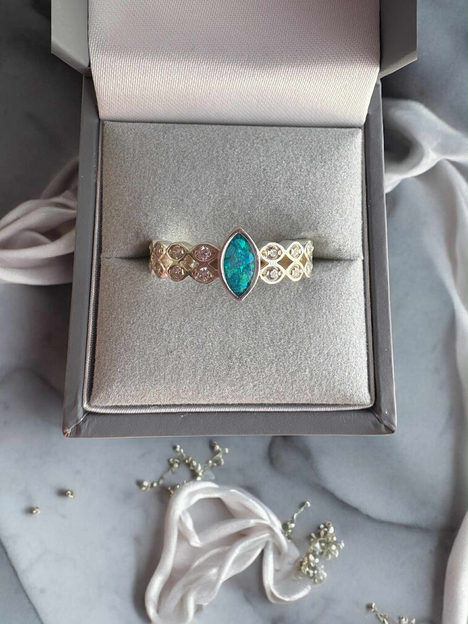 This stunning sterling silver ring features a captivating marquise-shaped centre stone, carefully set in a band of intricate detailing and cubic zirconia accents. The central setting holds your chosen inclusion, such as ashes, fur, or hair, delicately preserved within a shimmering resin colour of your choice. Elegant, timeless, and full of meaning, this ring is a beautiful way to honour someone you’ve loved, a daily reminder of their light, love, and lasting presence. Lovingly handcrafted with care and respect, keeping them beside you, always.