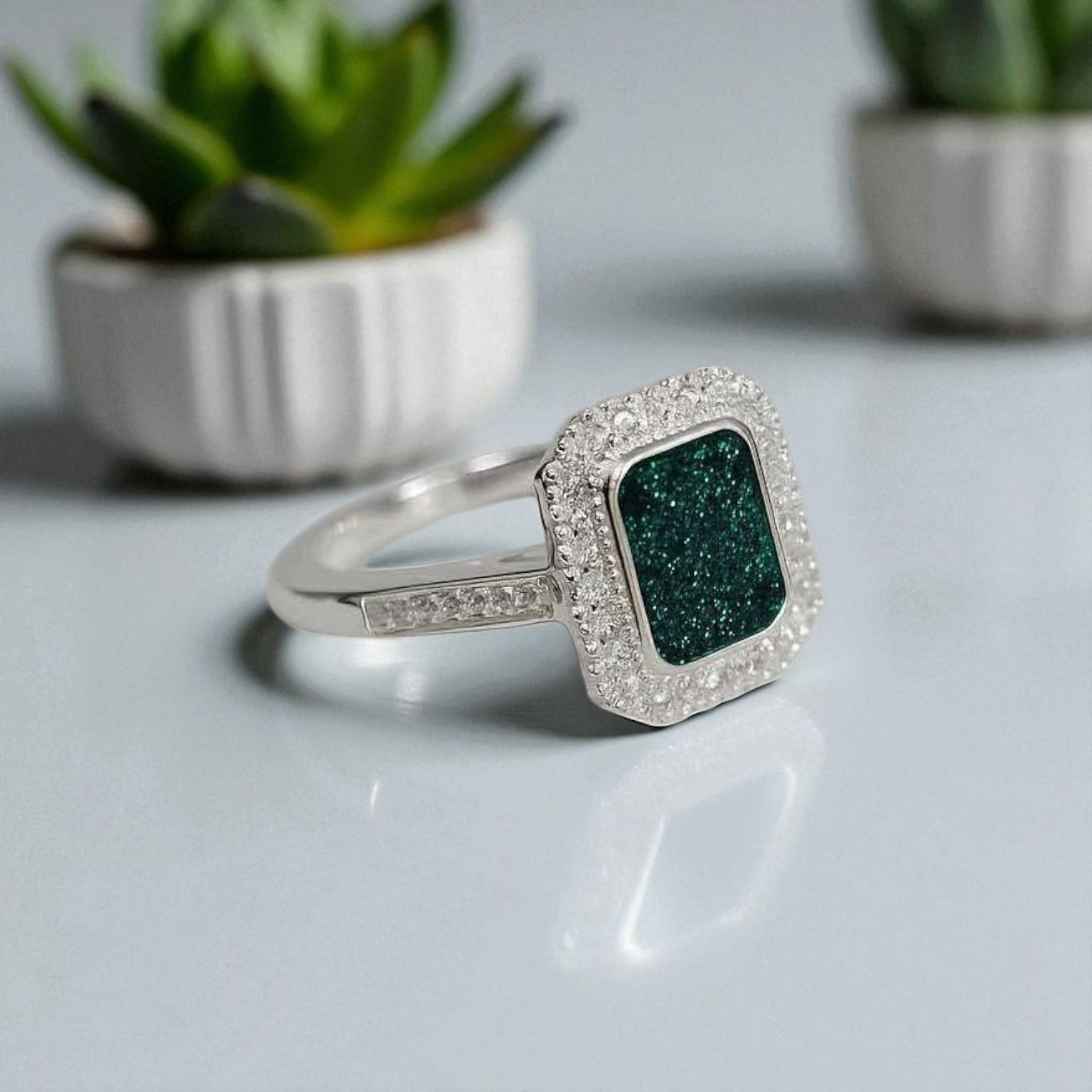 Elegant and full of presence, the sterling silver Rebecca Ring features a bold rectangular centre setting surrounded by a sparkling halo of cz stones. The shoulders of the ring are delicately accented for added brilliance, while the central stone holds space for your chosen inclusion, creating a meaningful and deeply personal tribute.