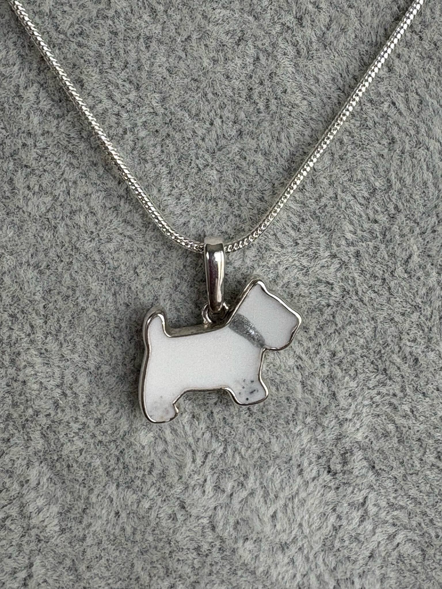 A charming tribute to your beloved companion, this sterling silver Scotty McDog Pendant is crafted in polished silver with a clean, modern silhouette. This piece is carefully made in white, (you can choose your own colour) creating a subtle yet striking contrast against the metal frame. The design allows for a discreet and meaningful memorial inclusion if desired, offering the option to keep a small amount of hair or ashes either hidden beneath or visible within the resin. A delicate piece that carries deep sentiment and is suitable for everyday wear, keeping them beside you, always.