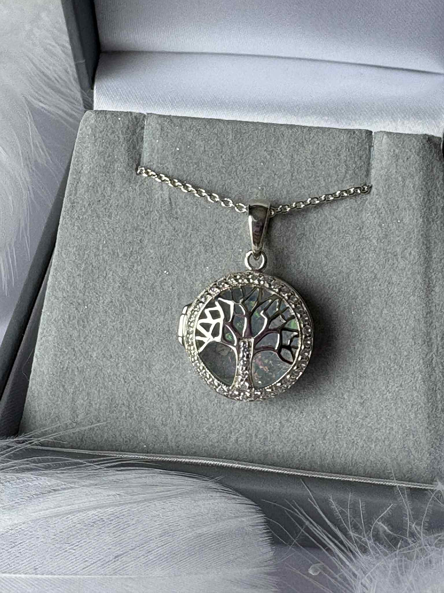 The intricate silver tree opens to reveal a softly shimmering centre, representing the lasting bond between you and someone deeply missed. Suitable for everyday wear.